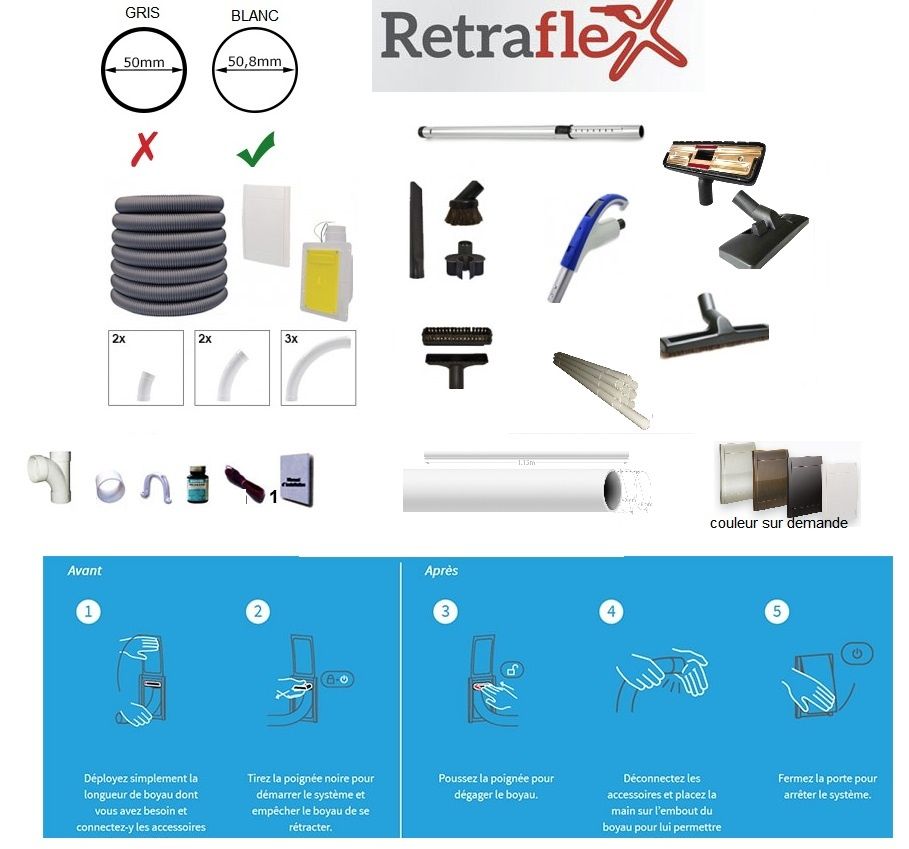 Lorsque son utilisation est terminée, le flexible Rétraflex se rétracte rapidement grâce à la force d'aspiration de votre aspirateur centralisé ( universel pour toutes les marques : démarrage filaire ). Le flexible Rétraflex est alors dissimulé dans le système de conduits installé à l'intérieur des murs.